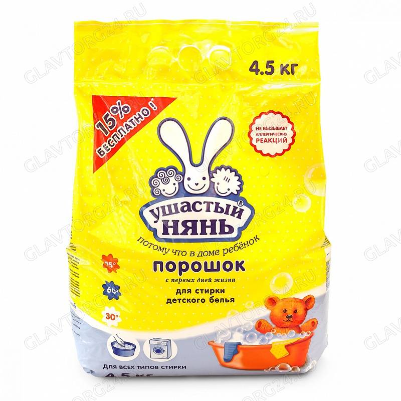 ОписаниеОдним из главных преимуществ детского стирального порошка УШАСТЫЙ НЯНЬ является то, что он гипоаллергенный. Порошок подходит для использования при стирке одежды малышей с первых дней жизни.УШАСТЫЙ НЯНЬ - идеальный стиральный порошок, который подходит как для машинной, так и для ручной стирки.Среди преимуществ стирального порошка УШАСТЫЙ НЯНЬ можно выделить следующие параметры:- стирает при температуре 30-95 С;- борется с загрязнениями на подгузниках, трусиках, шлепанцах;- подходит для стирки одежды из хлопка, льна, синтетических тканей, смешанных волокон, не вызывает налета и коррозии в стиральной машине-отбеливателе для детских вещей.Это лишь основные конкурентные преимущества детского стирального порошка УШАСТЫЙ НЯНЬ.Стиральный порошок устраняет неприятные запахи и придает белью приятный свежий аромат, который быстро исчезает с одежды. Предназначено для стирки детских изделий, в том числе новорожденных, из хлопчатобумажных, льняных, синтетических тканей, а также тканей из смешанных волокон (кроме изделий из