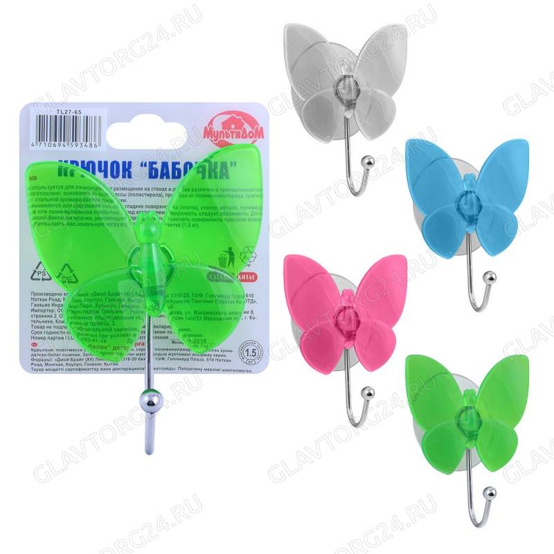 Крючок "Бабочка" на присоске 4цв