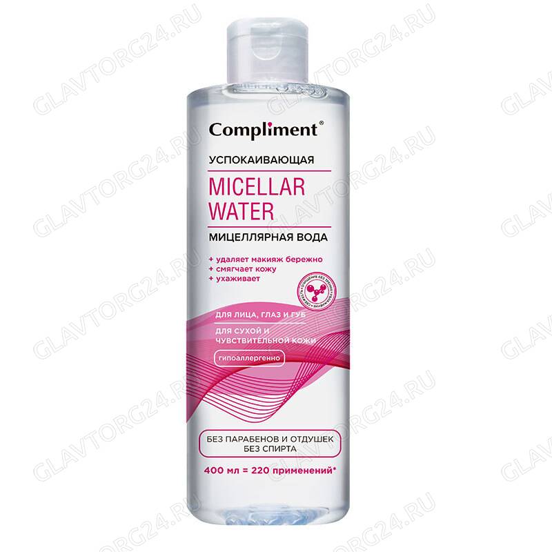 ОписаниеCompliment Мицеллярная вода для чувствительной кожи Успокаивающая 400мл. Мягкая мицеллярная вода для снятия макияжа с глаз и лица Комплимент бережно и эффективно очищает и деликатно ухаживает за кожей. Ее состав обогащен успокаивающими компонентами, которые увлажняют и смягчают сухую, чувствительную кожу. Пантенол способствует регенерации клеток и устранению шелушения. Олигосахариды поддерживают водный баланс и здоровье кожи. Средство для снятия макияжа— новшество в очищении, которое обладает сразу двумя свойствами: ОЧИЩЕНИЕ+УХОД. Активный компонент мицеллярной воды — мицеллы — это микроскопические соединения, способные удалять даже мельчайшие загрязнения и деактивировать вредные вещества, не разрушая липидную структуру кожи и сохраняя ее комфорт и мягкость. Идеальное очищение — Мицелярка для лица легко и естественно снимает макияж с лица, глаз и губ без лишнего трения, эффективно очищает кожу от загрязнений и кожного жира. Успокаивающая формула — Гипоаллергенная формула без отдушек, парабенов и спирта успока