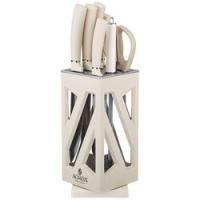 ● Состав набора: Нож поварской 20см, Нож для нарезки 20см, Нож для хлеба 20см, Нож универсальный 12,5см, Нож для чистки овощей и фруктов, 9см, Мусат, Ножницы для птицы, Вращающаяся подставка.