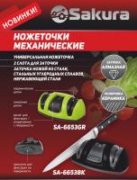 ОписаниеНожеточка механическая Sakura SA-6653 - Превосходная и невероятно удобная ножеточка с двумя стадиями заточки. Первая стадия с дисками с алмазным покрытием обеспечит правку и невероятно острую заточку вашего лезвия. Вторая стадия с керамическими дисками для шлифовки и полировки лезвий. Ваш нож станет невероятно острым! Прочная присоска для крепления к столу обеспечит невероятный комфорт при использовании. При заточке не нужно сильно давить на нож, требуется только легкое нажатие.