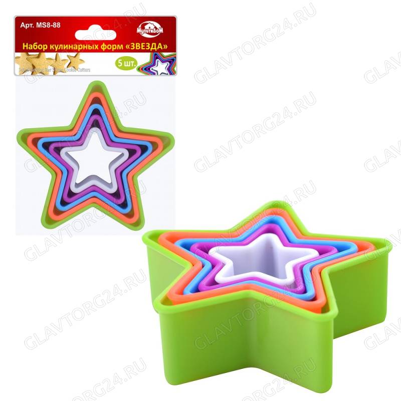 -Набор кулинарных форм "Звёзда". 5шт. НожиДержатели для полотенец и кружек, корзиныФорма для выкладкиОвощечистки, ножницы, рыбочисткаТопорик, молоток, тендерайзерСалфетка подстановочная, коврик для сушкиСито, ситечко, защита от брызг, дуршлагКрышки стекло, нержЛопаткиОткрывашки, штопор, пресс для чеснокаПоловники, ложки разливательные, гарнирныеНабор кухонныйКондитер. принадлежностиШумовки, венчикЩипцы, толкушкаТерки, шинковкиДозаторы, пробки для бутылокРейлинговая системаСушилки для посуды, подставки для крышек, досок и стол.приборов