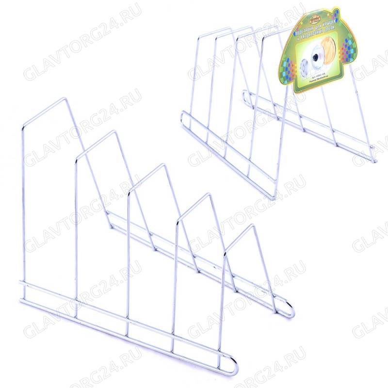 ОписаниеПодставка для крышек и разделочных досок - очень удобное приспособление, которое поможет Вам упорядочить кухонное пространство. Подставка универсальна и подойдет для крышек и досок любого размера. Разместите подставку в удобном для Вас месте и крышки с разделочными досками, всегда будут у под рукой. Изготовлена из металла с хромированным покрытием. Размер 26х15х19 см.