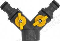 поток на две водопроводные линии. Два запорных клапана для регулировки напора воды. Быстросъемное соединение на разветвлениях. Внутренняя резьба