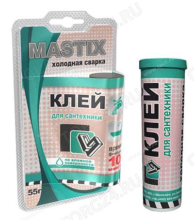 "Клей для сантехники "MASTIX" предназначен для быстрого и надежного склеивания, ремонта деталей и узлов, герметизации соединений и емкостей, для восстановления утраченных фрагментов изделий из керамики и фарфора, а также изцветных и черных металлов,пластмасс, дерева в различных комбинациях. Температура эксплуатации отремонтированных изделий от -60?С до +150?С. Обеспечивает надежный ремонт на влажных и замасленных поверхностях, при низких(до -10°С) температурах (при условии замешивания смеси в теплом помещении).